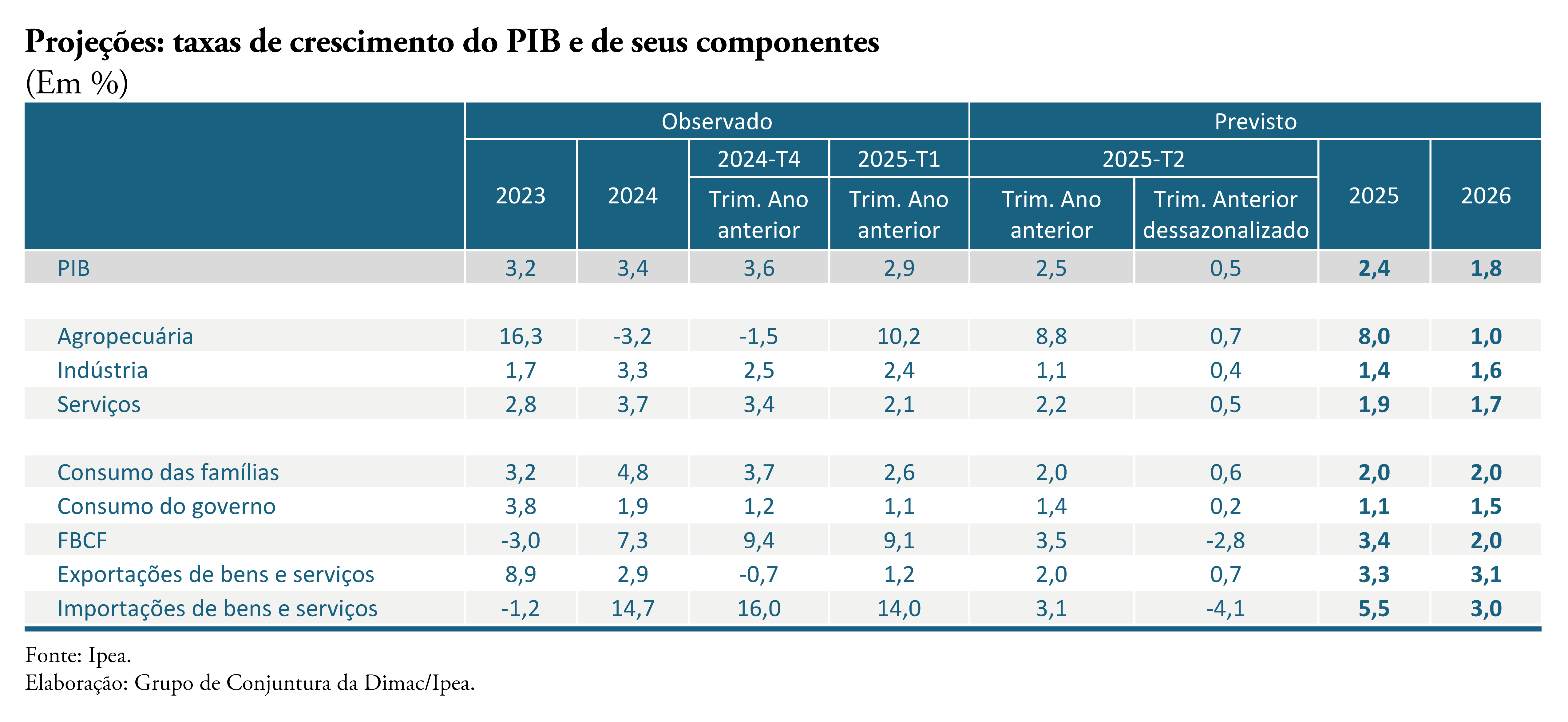 O Instituto de Pesquisa Econômica Aplicada (Ipea) manteve a previsão de crescimento da economia brasileira em 2,4% para 2025. Para 2026, a projeção caiu de 2% para 1,8%. As estimativas fazem parte da nova edição da Visão Geral da Conjuntura , divulgada nesta terça-feira (1º) pelo Grupo de Conjuntura da Diretoria de Estudos e Políticas Macroeconômicas do Instituto.