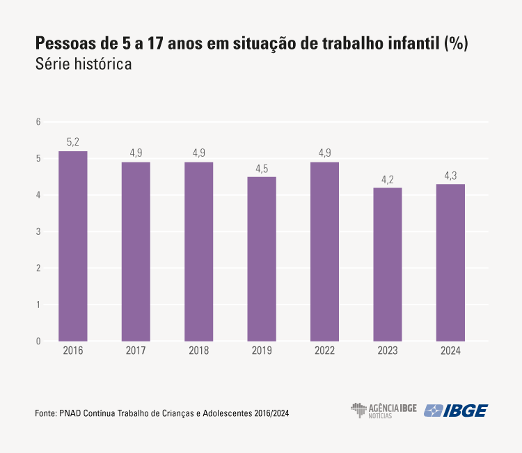 • O percentual de pessoas em situação de trabalho infantil chegou a 4,3% em 2024, uma oscilação de 0,1 ponto percentual em relação ao ano anterior (4,2%). Em 2022, eram 4,9%, enquanto em 2016, ano inicial da série, eram 5,2%.