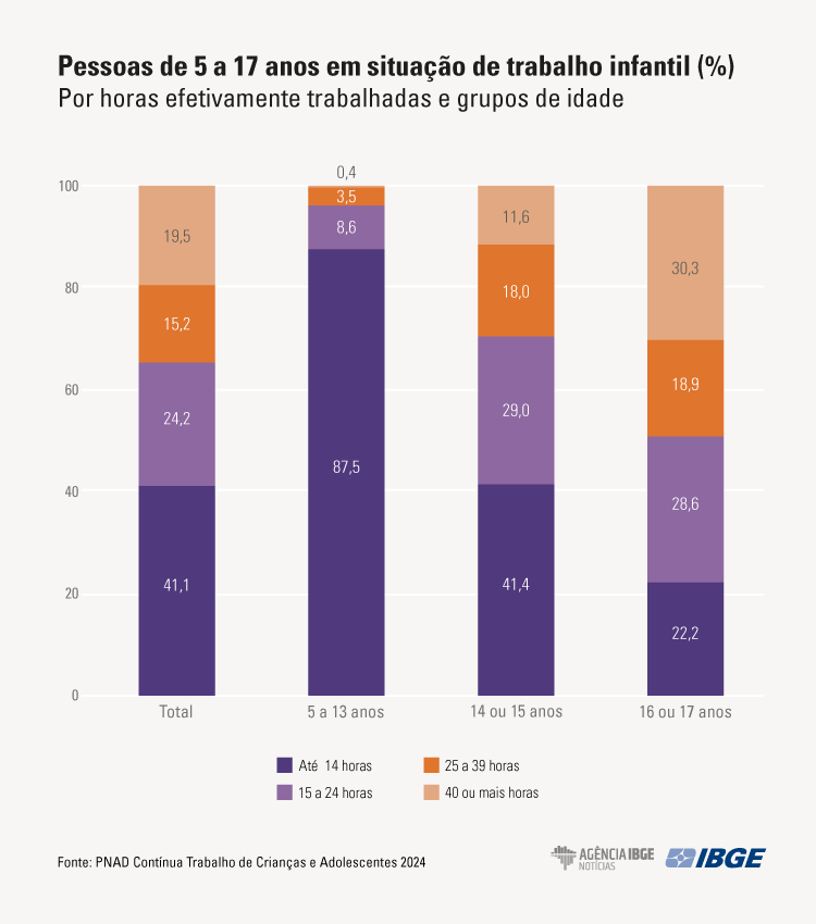 Entre as pessoas de 16 e 17 anos em situação de trabalho infantil, em 2024, 22,2% trabalharam até 14 horas por semana e quase metade (49,2%), mais de 25 horas, sendo que 30,3% por 40 horas ou mais. Entre os adolescentes de 14 e 15 anos, 41,4% trabalharam até 14 horas e 29,0%, de 15 a 24 horas.