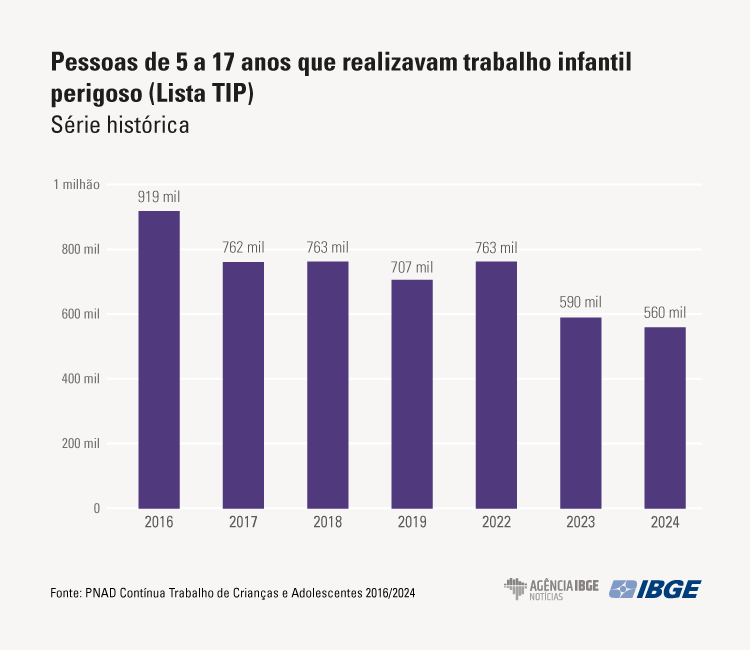 Em 2016, havia 919 mil crianças no país exercendo as piores formas de trabalho infantil. Entre 2016 e 2024, houve uma redução acumulada de 39,1% de crianças e adolescentes exercendo ocupações que constavam na Lista TIP.