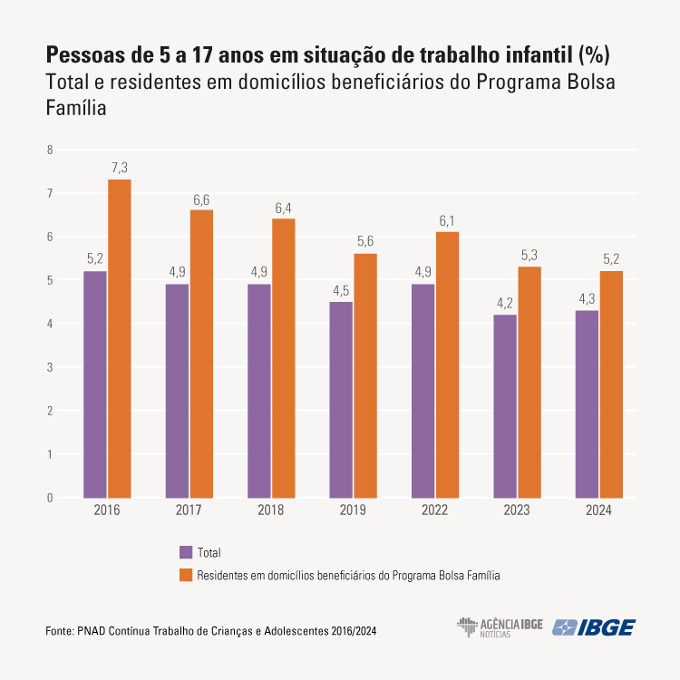 Entre as crianças e adolescentes de 5 a 17 anos em domicílios beneficiários do Bolsa Família em 2024, 5,2% estavam em situação de trabalho infantil (717 mil), contra 7,3% em 2016. Para o total de pessoas nessa faixa etária, o percentual passou de 5,2% em 2016 para 4,3% em 2024. “A prevalência do trabalho infantil continua um pouco mais elevada entre os beneficiários do Bolsa Família, quando se compara com o total da população de 5 a 17 anos, mas tem caído de forma mais rápida ao longo da série. Em 2024, a diferença se reduziu para apenas 0,9 ponto percentual”, observa Gustavo.